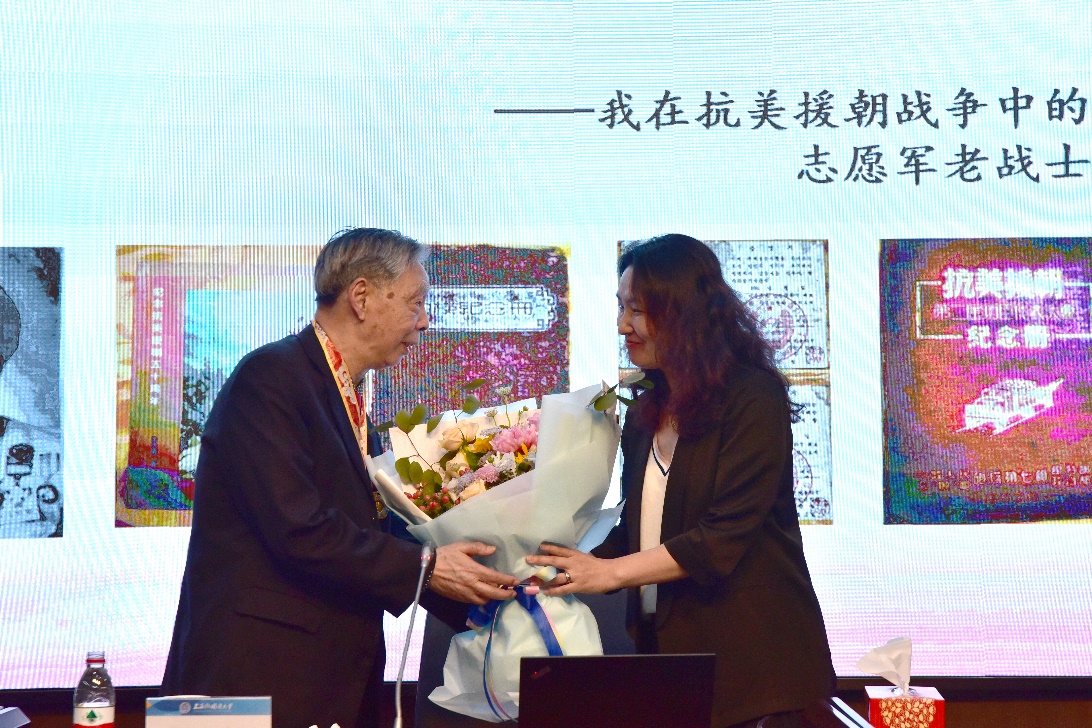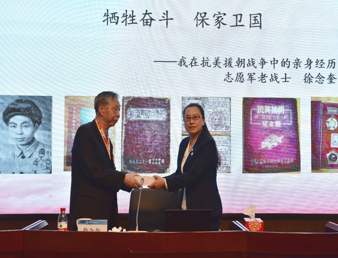 党课在热烈的掌声中画上了圆满的句号,学院党委书记杨雪莲代表学院全体教职工向徐老致敬和感谢,杨老师说道,徐老讲得从容淡定,动情落泪,我们听得惊心动魄,深受感动深受震撼,中国人民志愿军在朝鲜战场经历了血与火、生与死的考验,无愧于“最可爱的人”这个光荣称号!正如习近平总书记去年10月在纪念中国人民志愿军抗美援朝出国作战70周年大会上发表的重要讲话中指出的,我们要铭记抗美援朝战争的艰辛历程和伟大胜利,让伟大抗美援朝精神永续传承、世代发扬!