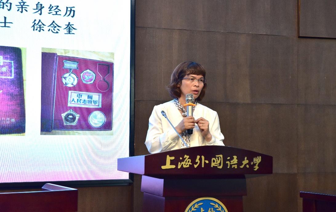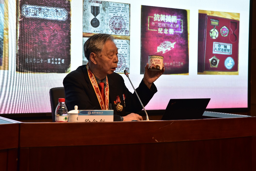 离休后,徐老在抗美援朝50周年之际出版了《难忘的日日夜夜》回忆录,重现了当时的那段血色历史。接着,徐老为大家讲述了几个自己和战友们艰苦奋斗、不畏艰险的感人事迹,从“不洗脸、不刷牙、饼干罐头走天下”的城山观测所军旅生涯,到城山山头浴血奋战、战友牺牲,徐老被坦克击中负伤一时不省人事仍坚持不下火线的难忘经历,再到身边守护阵地、守护车辆、为抗美援朝抛头颅洒热血不惜牺牲一切的战友群像……徐老深情回忆,动情讲述,几度落泪,现场各位老师也备受感动倍感震动。“摸爬滚爬在泥地水沟,战斗生活非常艰苦,九死一生的危险时刻出现,我们却保持高涨的情绪和战斗意志,因为我们吃苦,祖国人民才安居乐业。所以我们以苦为乐,虽苦犹荣!我们热爱党,热爱社会主义祖国,英勇杀敌、为国献身,这就是我们坚定的革命理想!”峥嵘岁月可爱的人们,为了祖国和人民,坚守阵地、不畏艰险,即便面临生命的威胁依然保持高昂的斗志和革命乐观主义精神,英勇地击退了来犯的敌军,充分展现中国人民志愿军的精神风貌和家国情怀。