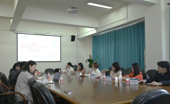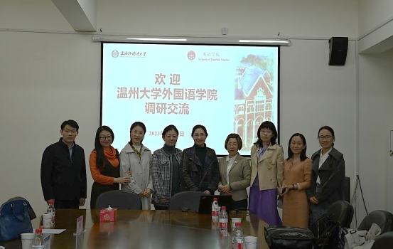 4月10日,温州大学外国语学院院长叶苗、翻译系系主任夏蓉等一行六人来必赢官网调研交流。必赢官网院长王欣、翻译系系主任肖维青、青年教师庄驰原陪同接待。